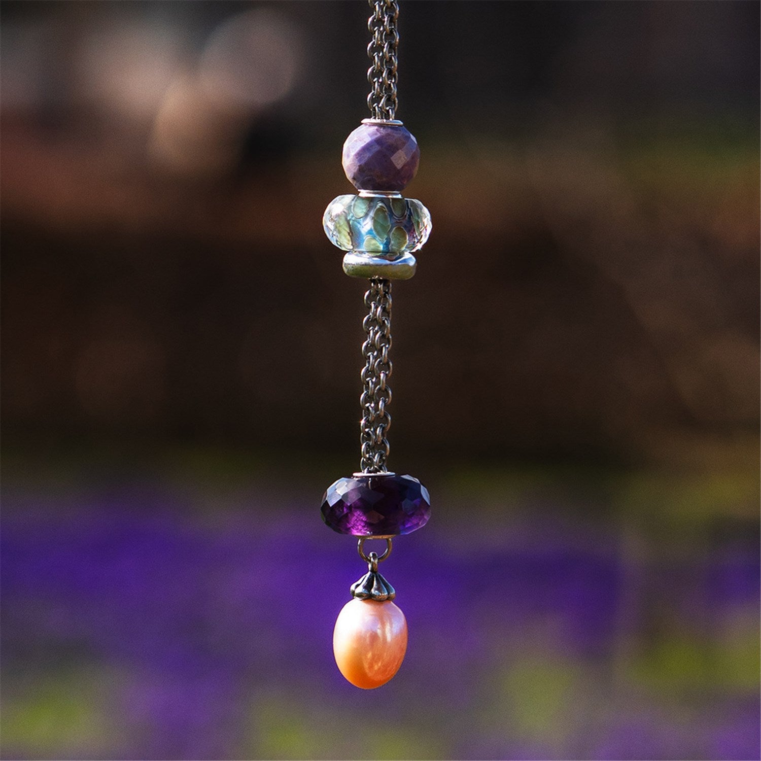 Delikatne odcienie lawendy, mięty i jasnego błękitu łączą się pod fasetowaną powierzchnią. Każdy koralik jest ręcznie wykonany ze szkła, tworząc mglistą głębię, która subtelnie zmienia się wraz ze światłem.