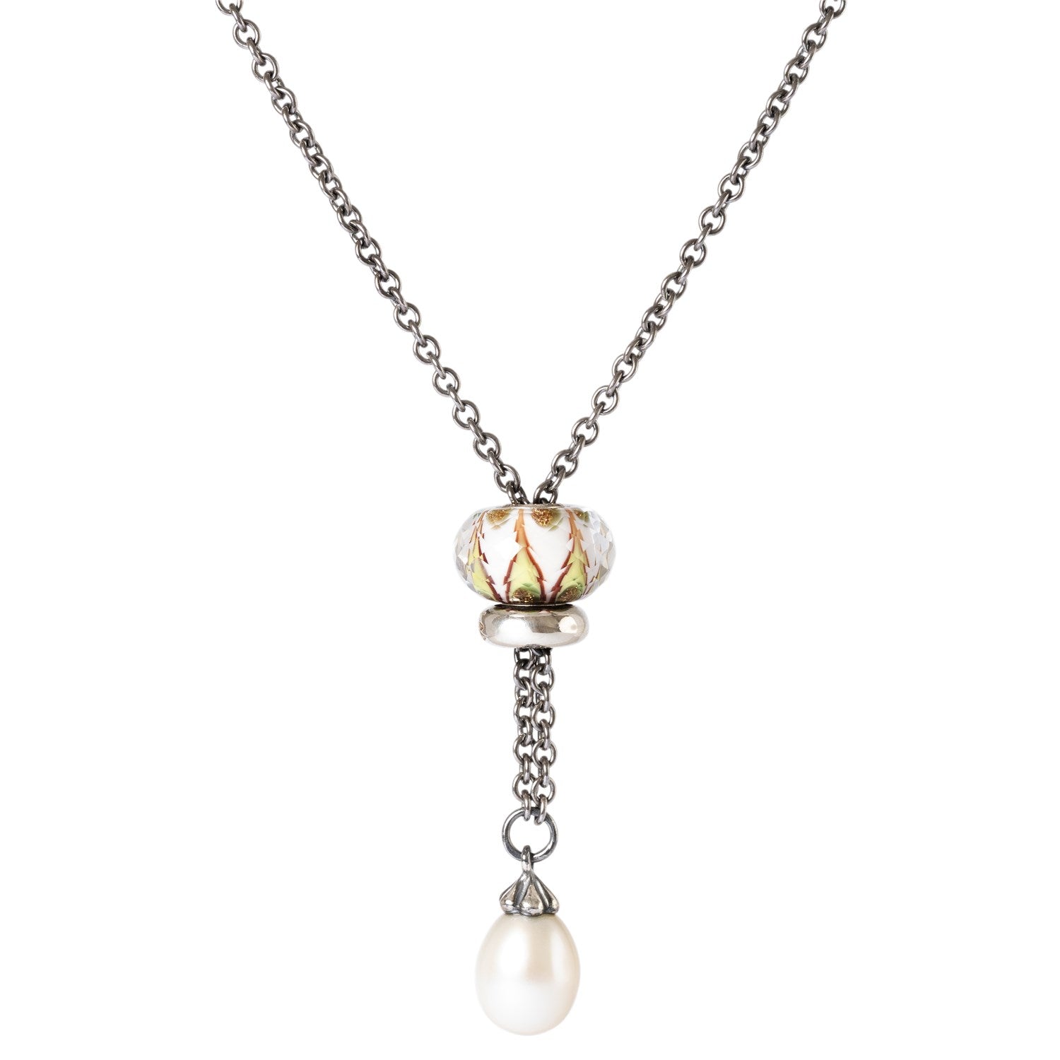 Odkryj swoją wewnętrzną melodię i spraw, by była wyjątkowa. Ten czarujący naszyjnik fantasy, wykonany ze srebra próby 925, ozdobiony jest ponadczasowym wisiorkiem z naturalną perłą słodkowodną. Na delikatnym łańcuszku spoczywa fasetowany koralik Green Symphony ze szkła, oddzielony srebrnym dystansem — jego miękkie odcienie i subtelny, złocisty połysk dodają całości eterycznego piękna.